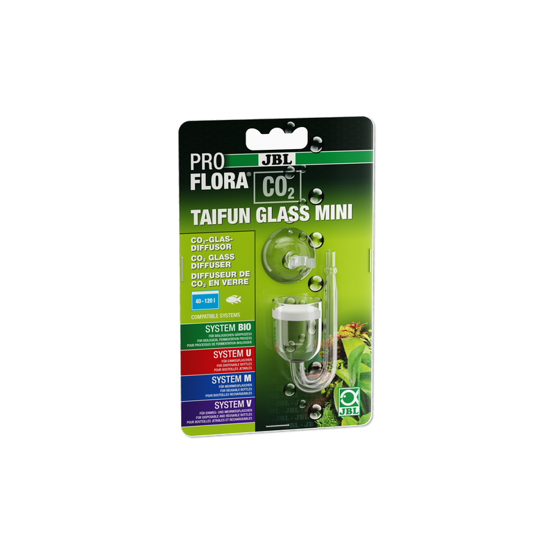 Bitkiler için ideal beslenme Akvaryum bitkileri için sudaki doğru CO2 oranı büyük önem taşır. Karbondioksit bitkilerin temel besin maddesidir ve görkemli bir şekilde gelişmelerini teşvik eder. Bitkiler CO2'yi fotosentez için kullanır ve buna karşılık suya yaşamsal önem taşıyan oksijen salarlar. Yosun gelişimini önler, zararlı maddeleri giderir, saklanma olanağı sunar ve hastalık mikroplarını azaltırlar. Akvaryum suyunun CO2 bakımından verimli bir şekilde zenginleştirilmesi: CO2, difüzörün içerdiği özel bir membran üzerinden akvaryum suyuna nüfuz eder. Çok küçük olan CO2 kabarcıkları akvaryum suyunda çok iyi çözünür. JBL TAIFUN GLASS difüzörü 3 ayrı boyda mevcuttur: JBL PROFLORA CO2 TAIFUN MINI: 40 ila 120 l arasındaki akvaryumlar içindir, yükseklik 67 mm, genişlik 37 mm, vantuz içermez, difüzör çapı 25 mm JBL PROFLORA CO2 TAIFUN MIDI: 60 ila 300 l arasındaki akvaryumlar içindir, yükseklik 76 mm, genişlik 42 mm, vantuz içermez, difüzör çapı 30 mm JBL PROFLORA CO2 TAIFUN MAXI: 160 ila 800 l arasındaki akvaryumlar içindir, yükseklik 90 mm, genişlik 58 mm, vantuz içermez, difüzör çapı 40 mm